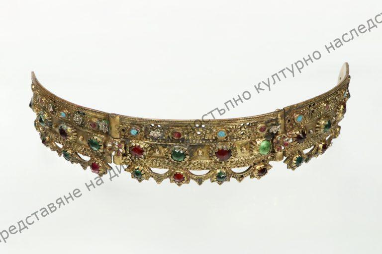 От бронз. Състои се от три части, свързани с шарнир. Украса от камъчета, композиция от лети цветчета, гранулирана повърхност, ажурен ръб