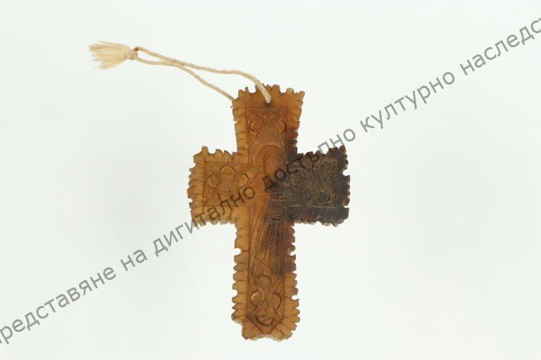 От животинска кост. Зигзаговидно издълбан по краищата. Изобразени религиозни мотиви от двете страни. От Света гора, подарен на дядо Вълчо Симеонов от с. Мараш за построяването на църквата в селото