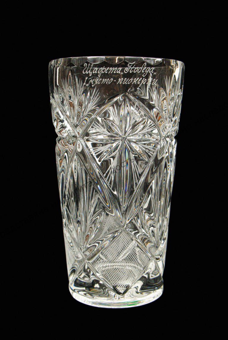 Спортна, тип ваза. От кристал, с инкрустация. Надписът е с бели букви.