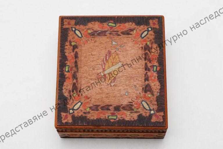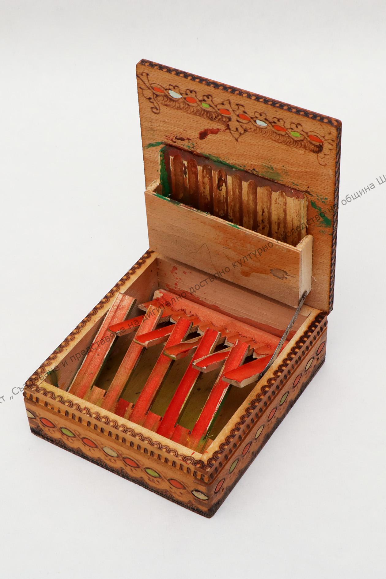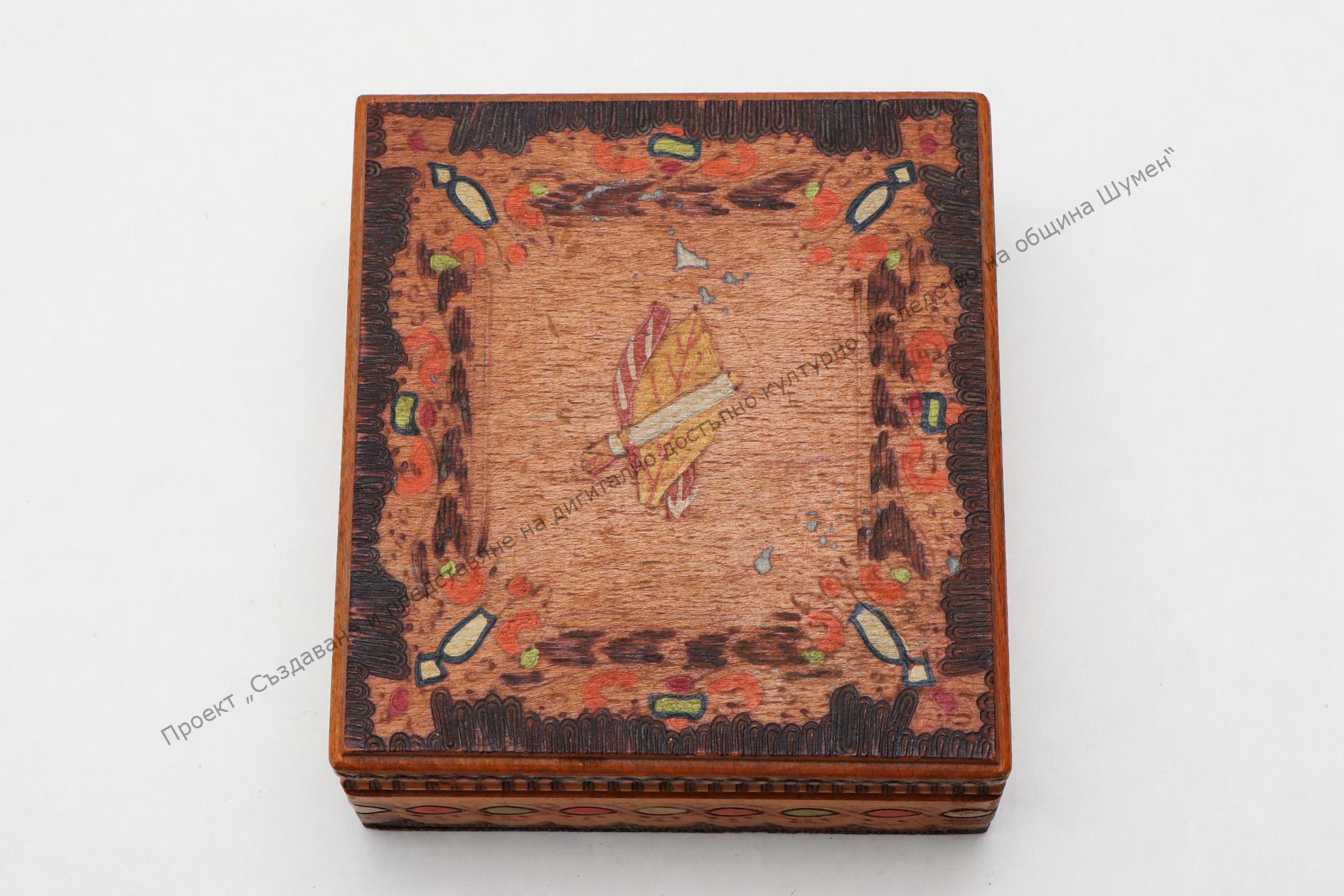 For cigarettes. Inside with compartments. Pyrographed and colour decorated, the 60s of the 20th century
