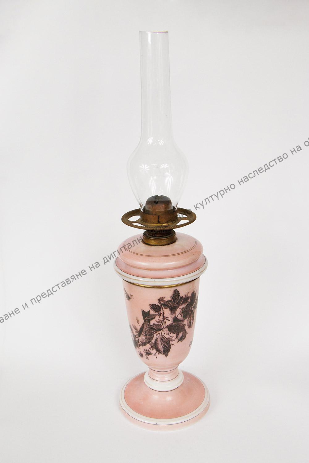 От плътно, матово, розово стъкло. Най-отгоре има метален механизъм за фитила