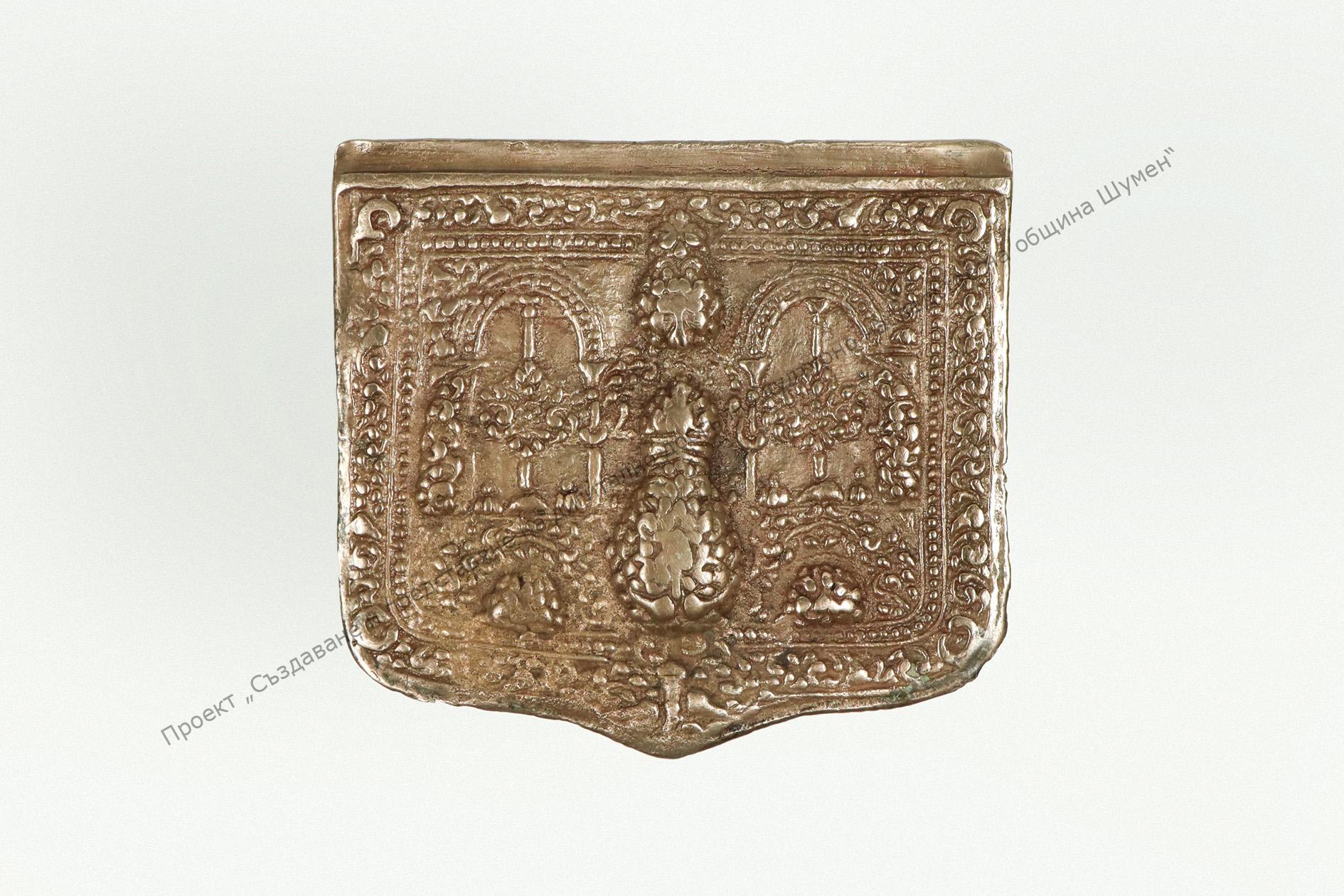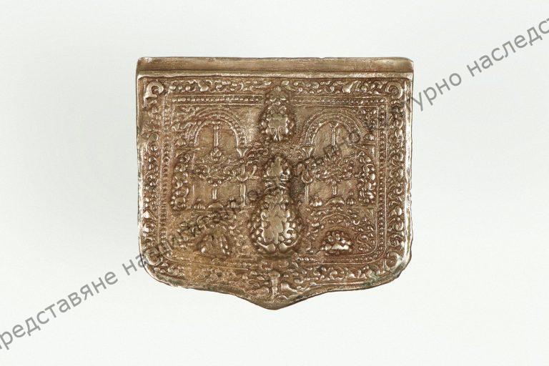 Of metal, almost square shape. Rich relief floral decoration
