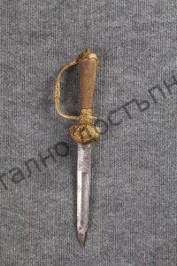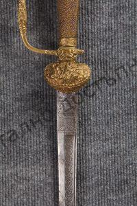Germany. Single-edged steel blade with a fuller. The guard is of cast bronze with ornamental elements. At the base of the guard is attached a “shell” – a characteristic part of ceremonial weapons in 18th – 19th centuries, with a hunting scene depicted on it. The grip is covered with stingray skin.