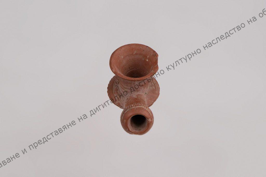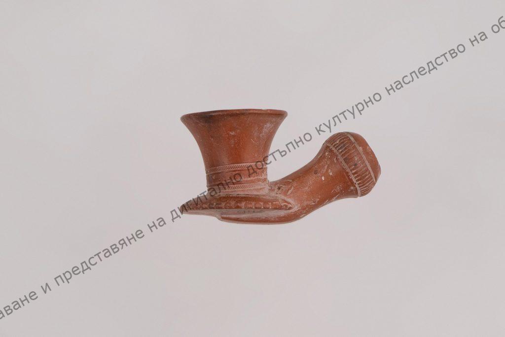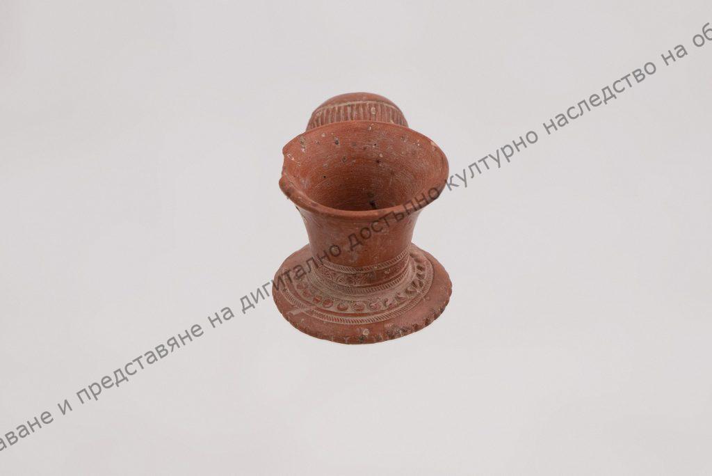 Чашката за тютюн без украса, разширена в горния край, долу три пояса – 2 от дребни успоредни чертички и среден – стилизирани клонки. Поставката кръгла, назъбена с пояс – шнуровиден и един ред средно големи клонки