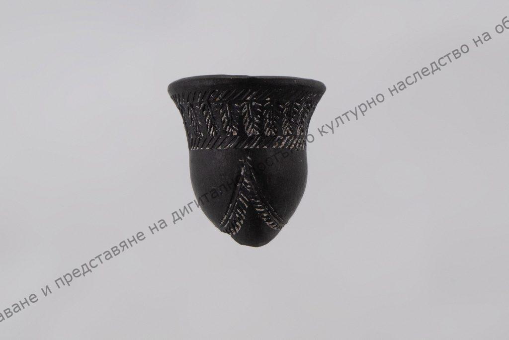 Запазена само чашката за тютюн. В горната част разширена. Бордюр от успоредни чертички, между тях малки листчета, наредени едно до друго.