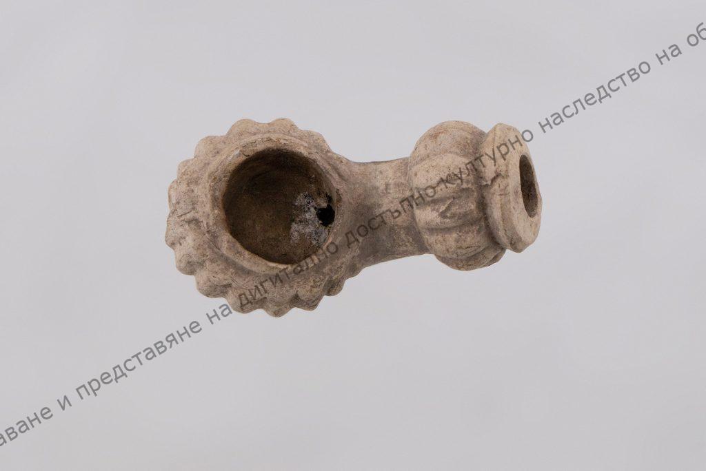 Чашката за тютюн поставена върху кръгла поставка с изпъкнали заоблени ивици. Всмукателната тръбичка завършва с пръстен от същите ивици.