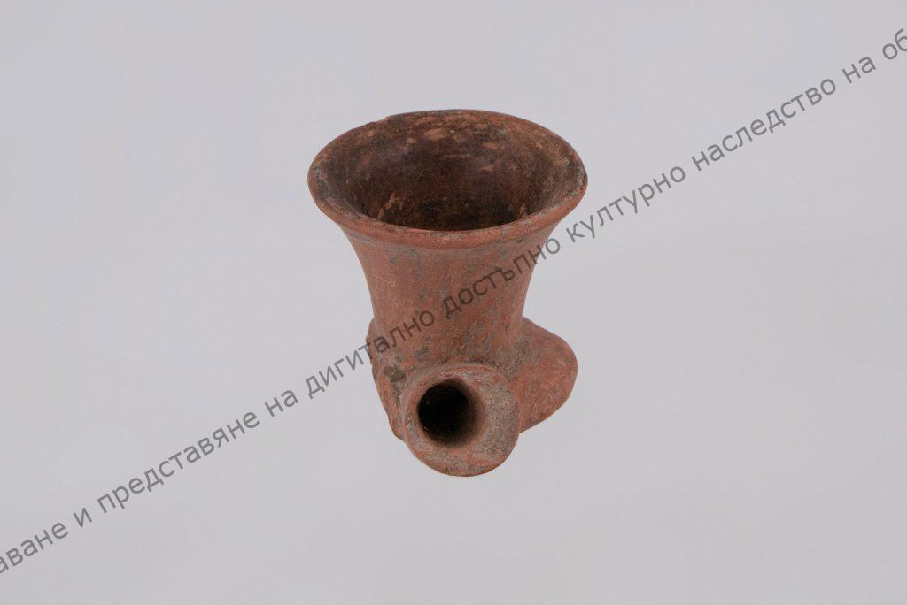 Чашката за тютюн разширена в горния край, поставена върху кръгла гладка поставка. Личат 2 успоредни кръга за украса.