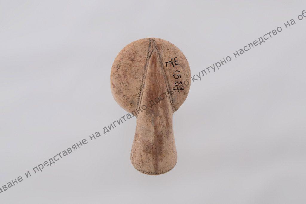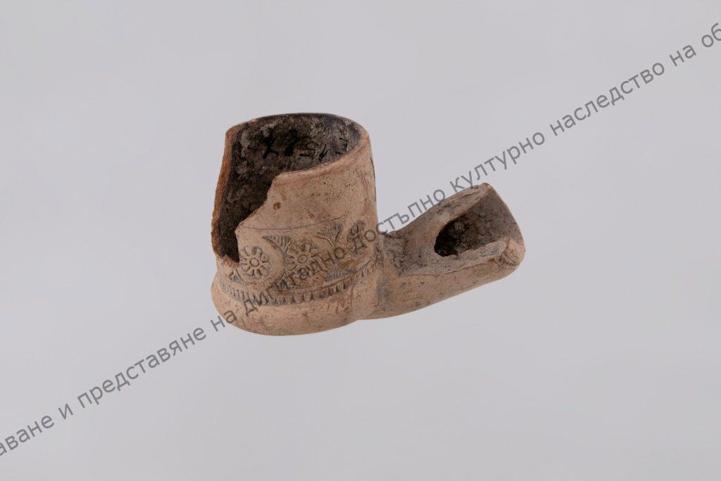 Чашката за тютюн с цилиндрична форма върху кръгла поставка със заоблен ръб. Украсена с кръгчета с по едно цвете в средата. Горният ръб гладък.