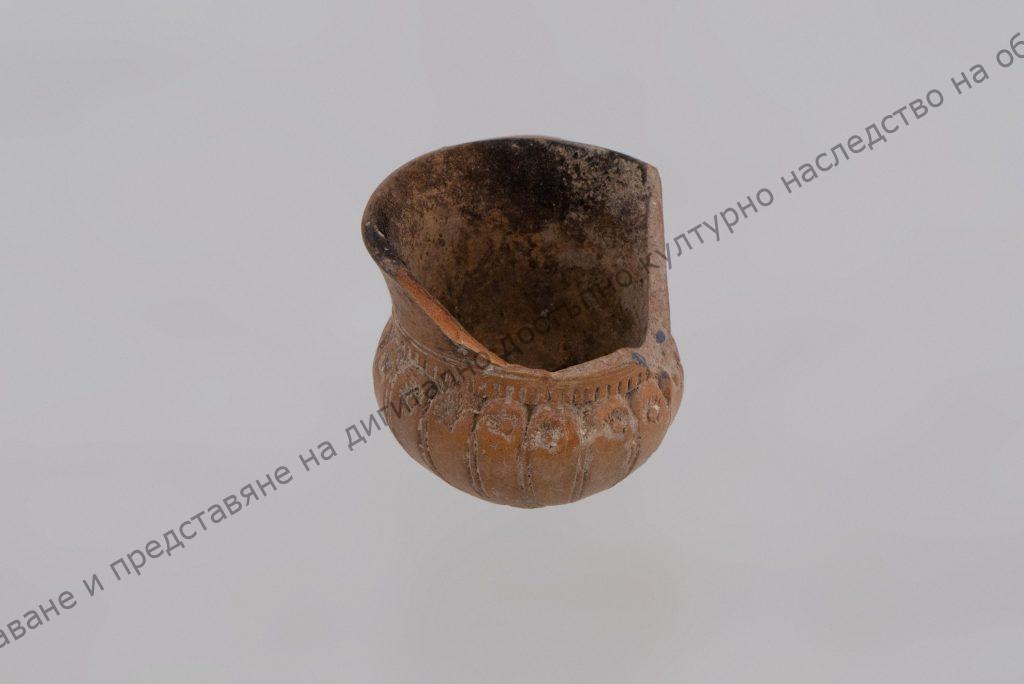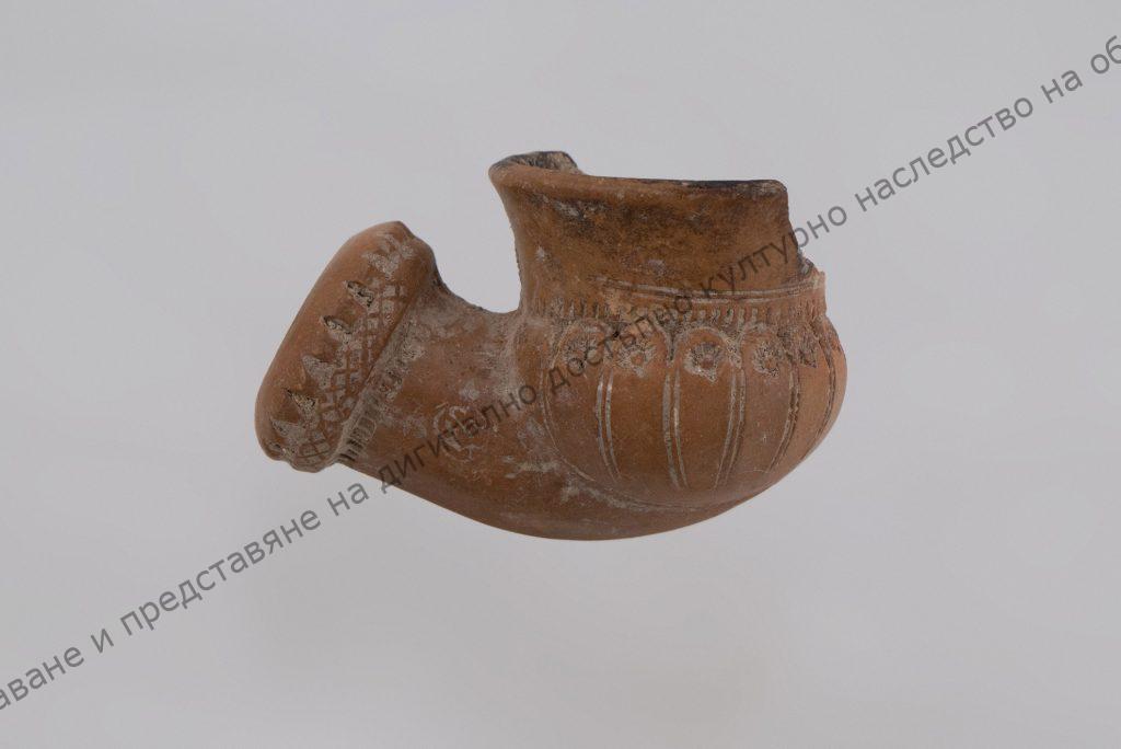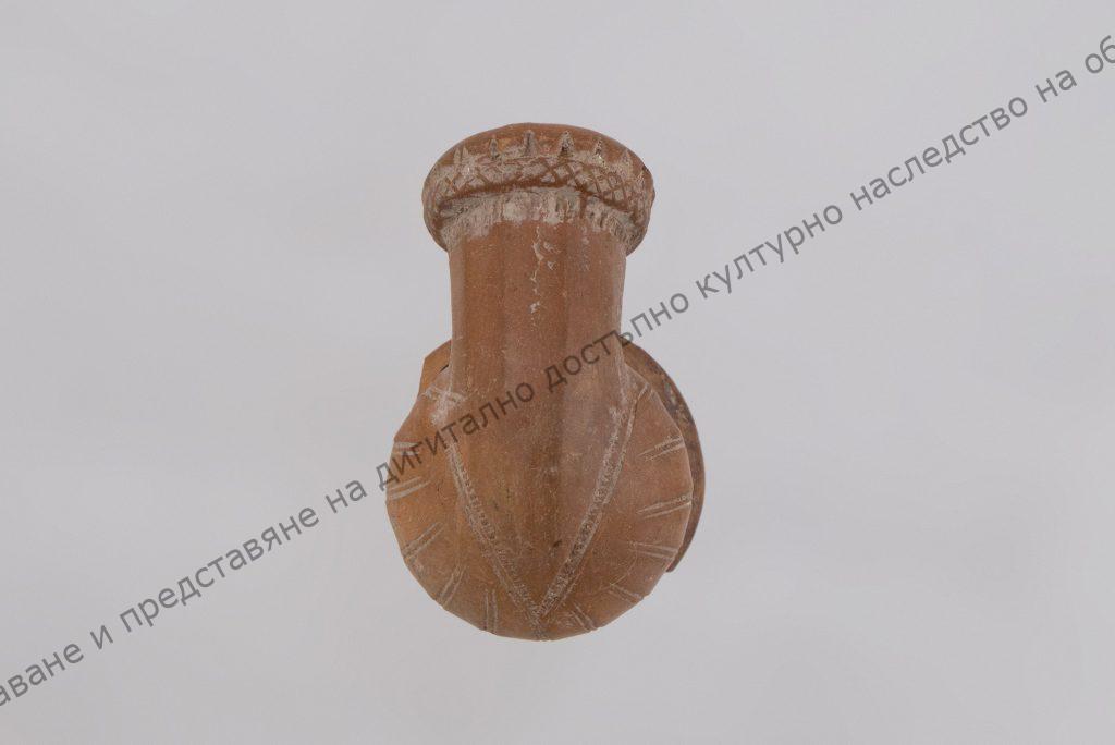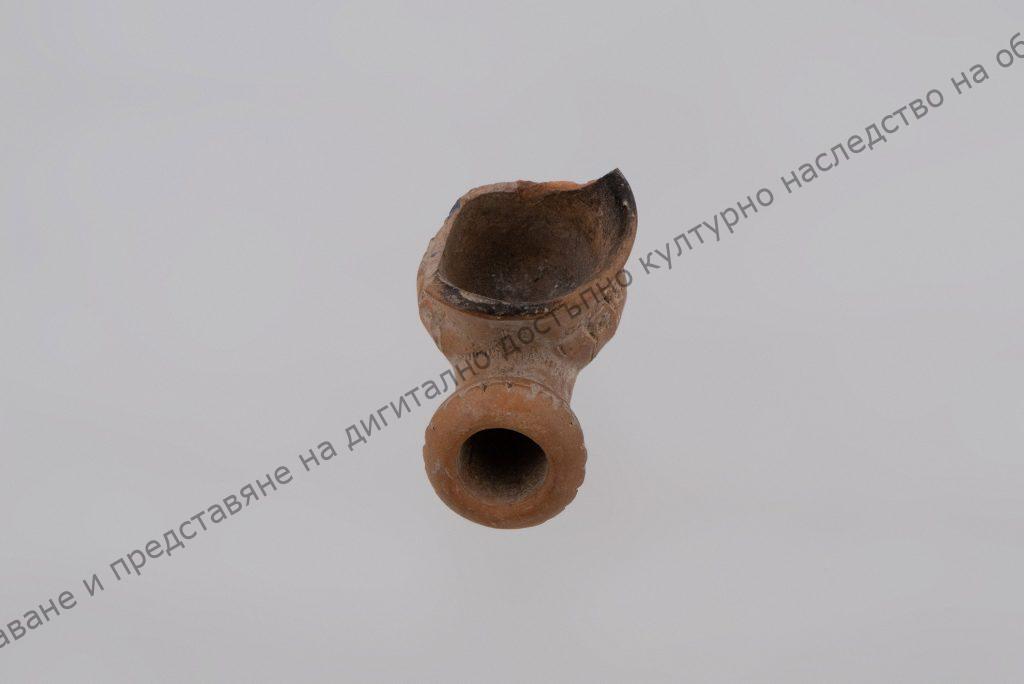 Украсена с радиални врязани линии, завършващи със стилизирано цветче и 2 също врязани линии под ъгъл. Тръбичката е цилиндрична, завършва със залепен пръстен с X-овиден фриз. Има печат.