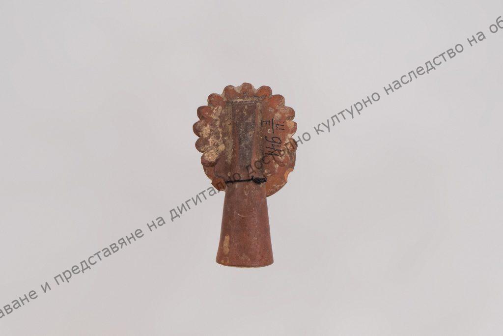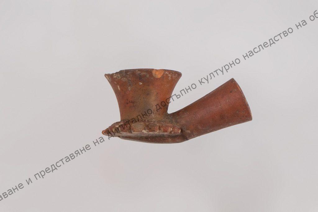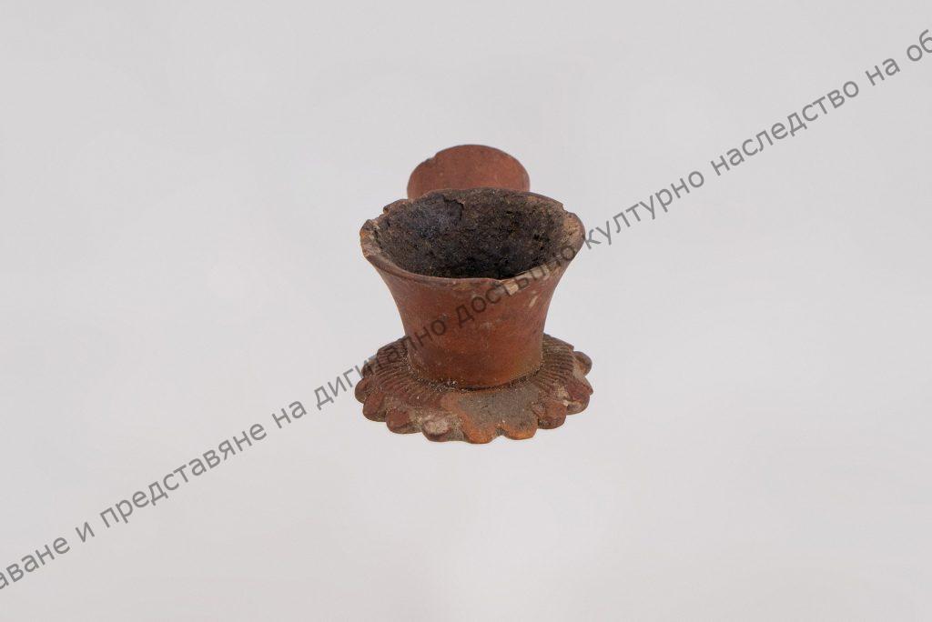 Чашката за тютюн без украса, разширена в горния край, поставена върху кръгла поставка, назъбена, бордюр от успоредни, радиално разположени чертички
