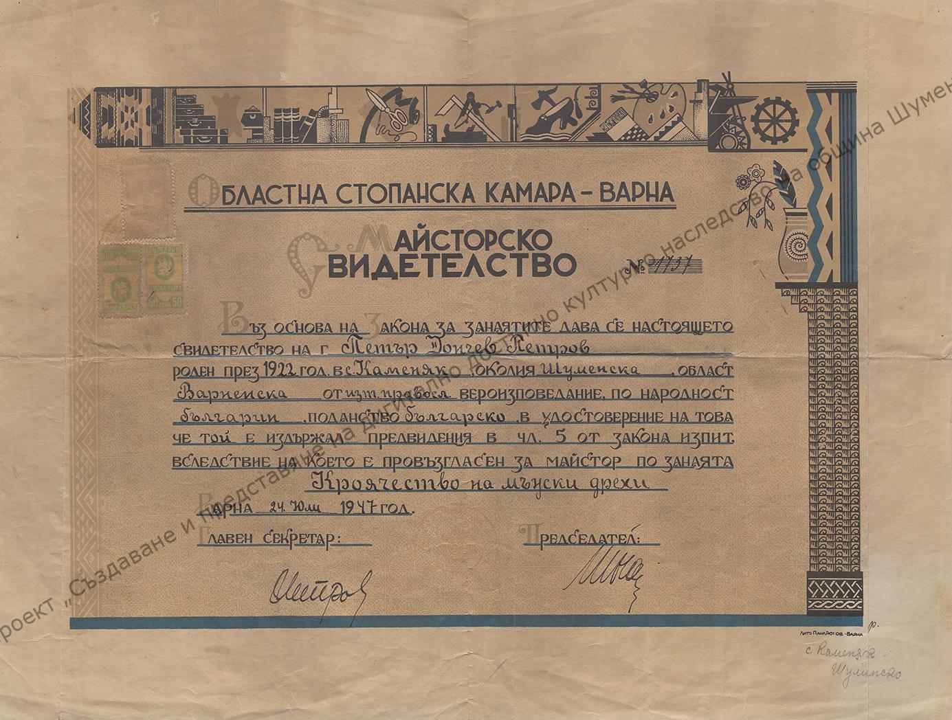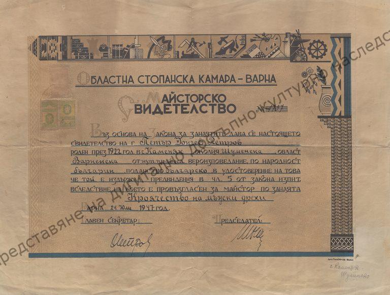 To Petar Donchev Petrov from the village of Kamenyak for passing the exam and being declared master in the craft of tailoring men’s clothes, 24th of July 1947