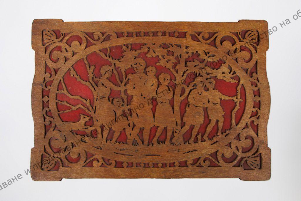 Дърворезба, ажурна, на шперплат. Четириъгълна плоскост, върху която е изобразена сцена със 7 човешки фигури сред дървета, след тях тича куче, отдолу червен плат. На високи крачета в правоъгълна рамка със същата резба, долу от двете страни с дъговидна извивка. Помежду им фруктиера. От едната страна под плата на масичката приковани инициалите ,,В.М”, а от другата страна – ,1931 г.”. На късите страни с по-дребен шрифт запазена част от надписа ,,споменъ’’