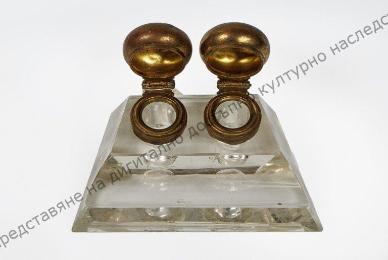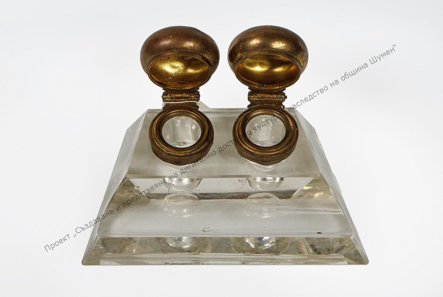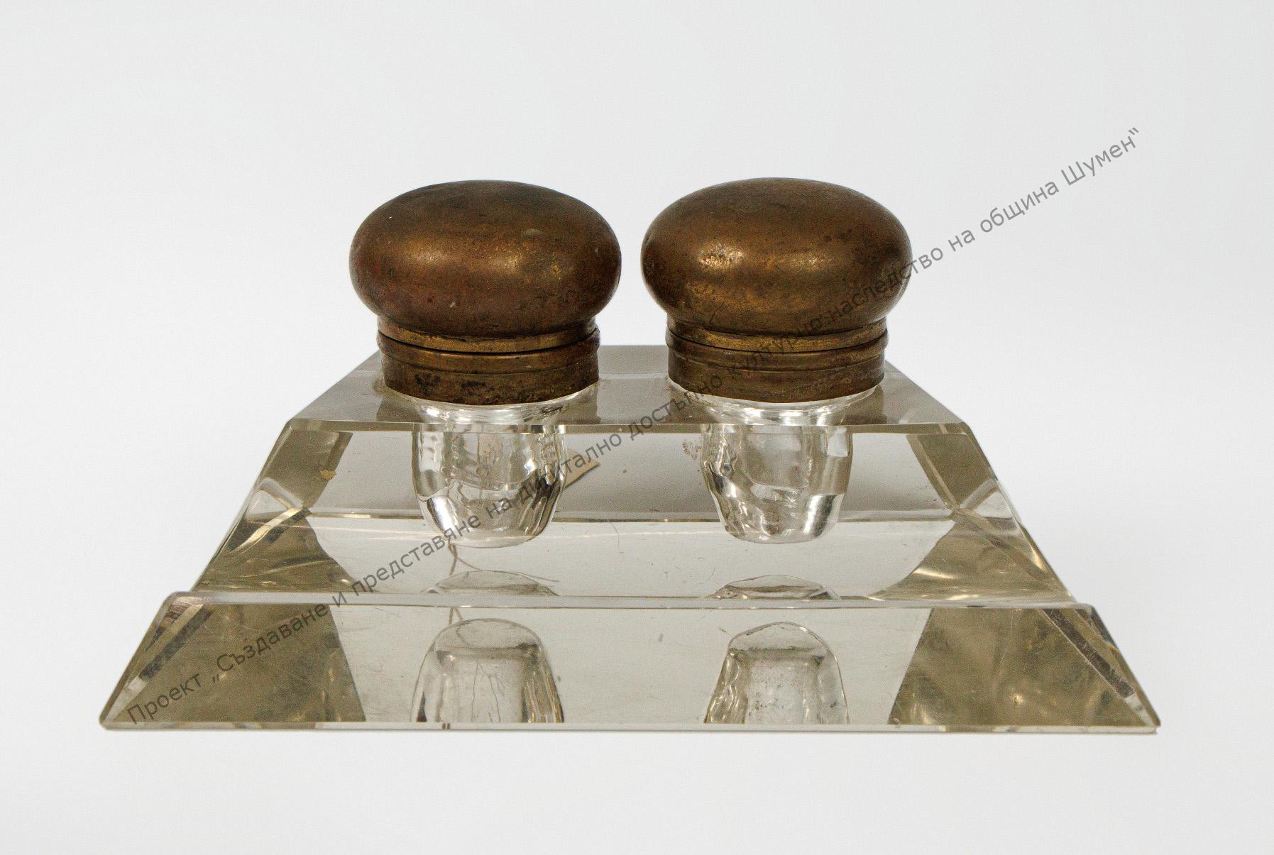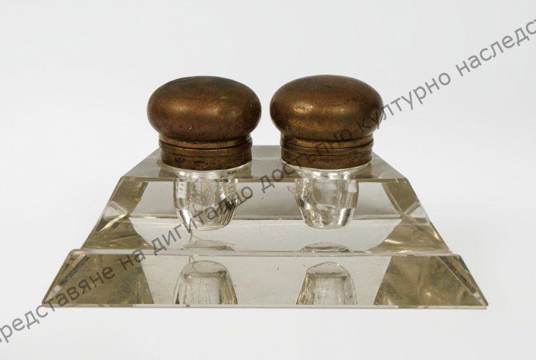 Изработена от прозрачно стъкло. С две чашки за мастило и място за перодръжки.
