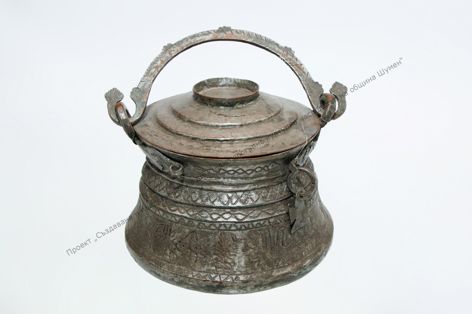 От мед, калайдисано, с капак. Гравирано с геометрични и растителни орнаменти