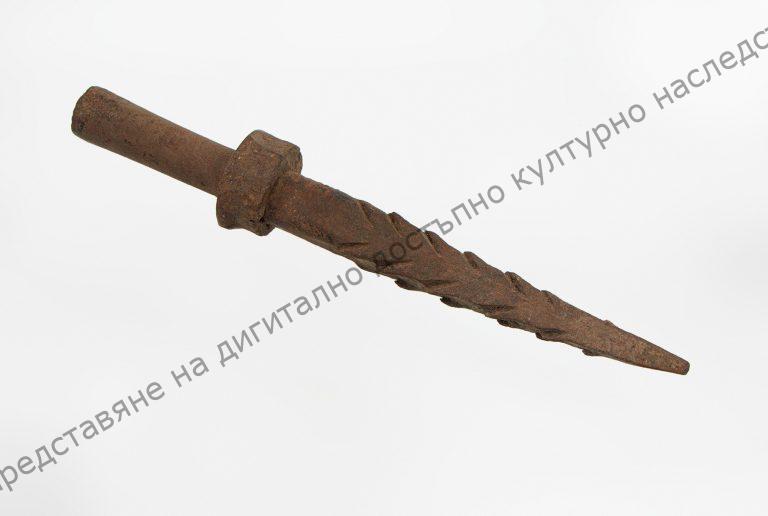 Made of wrought iron. Pointed lower part wtih prongs for securing into the ground