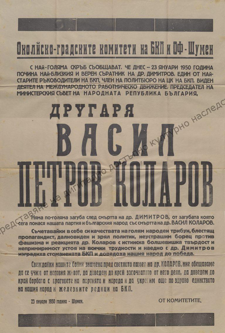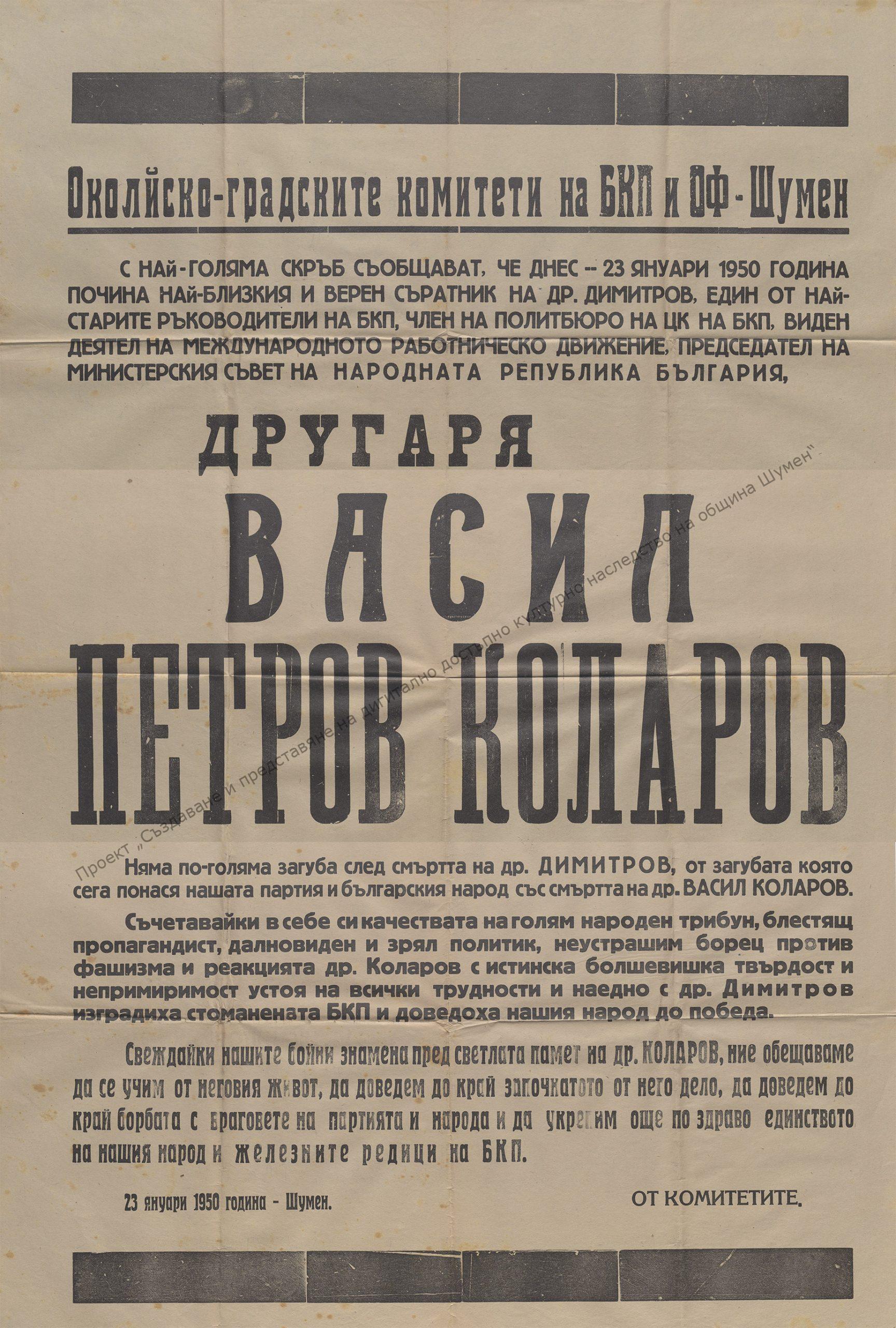 Издаден от околийско-градския комитет на БКП и ОФ гр. Шумен по повод смъртта на В. Коларов.