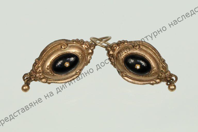 От жълт метал. Елипсовидна форма, пресована украса, в средата камъче. Носени около средата на XX век в с. Кюлевча