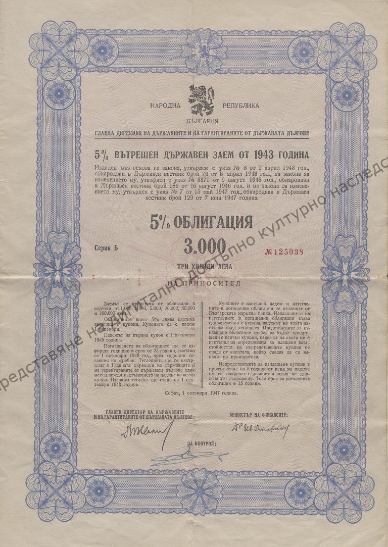 За 3 хиляди лева, съдържа купони с падеж 1.X.1947 г.