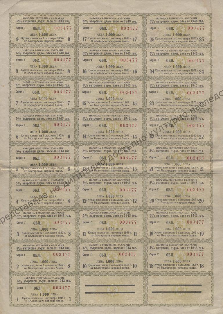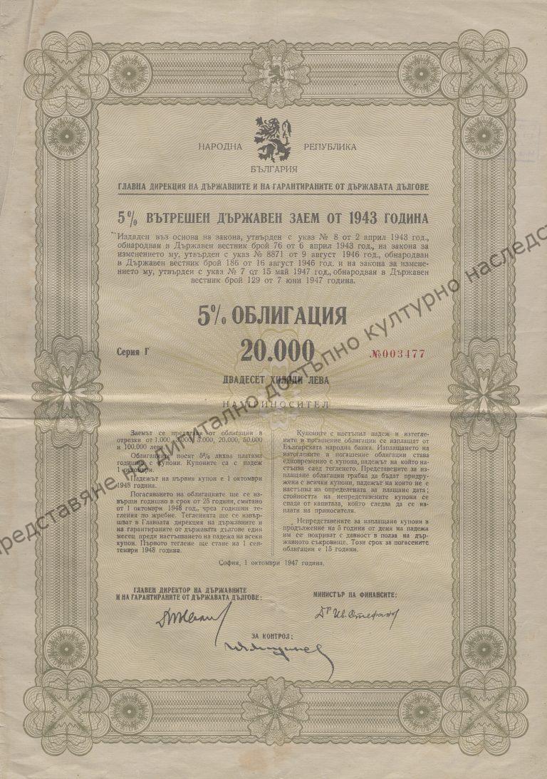 5 % от 20 000 лева. Издадена на 1.X.1947 г. Серия Г №003477