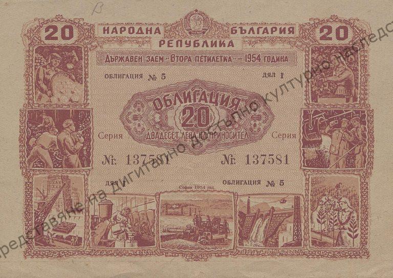 По 20 лева от Държавен заем – Втора петилетка – 1954 г.