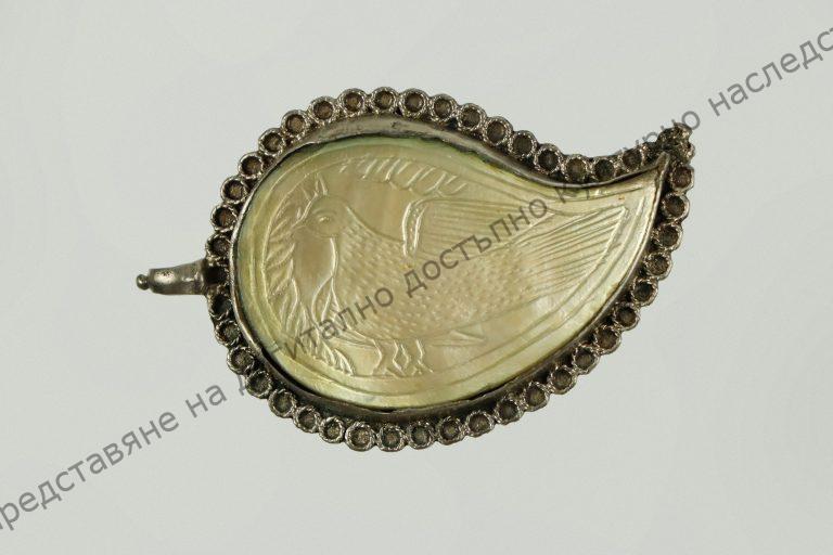 Форма на индийска палмета. Метална подложка с дребни колелца от усукана тел по края. Плочките седефени с изпъкнала украса от птица и стилизирани листенца