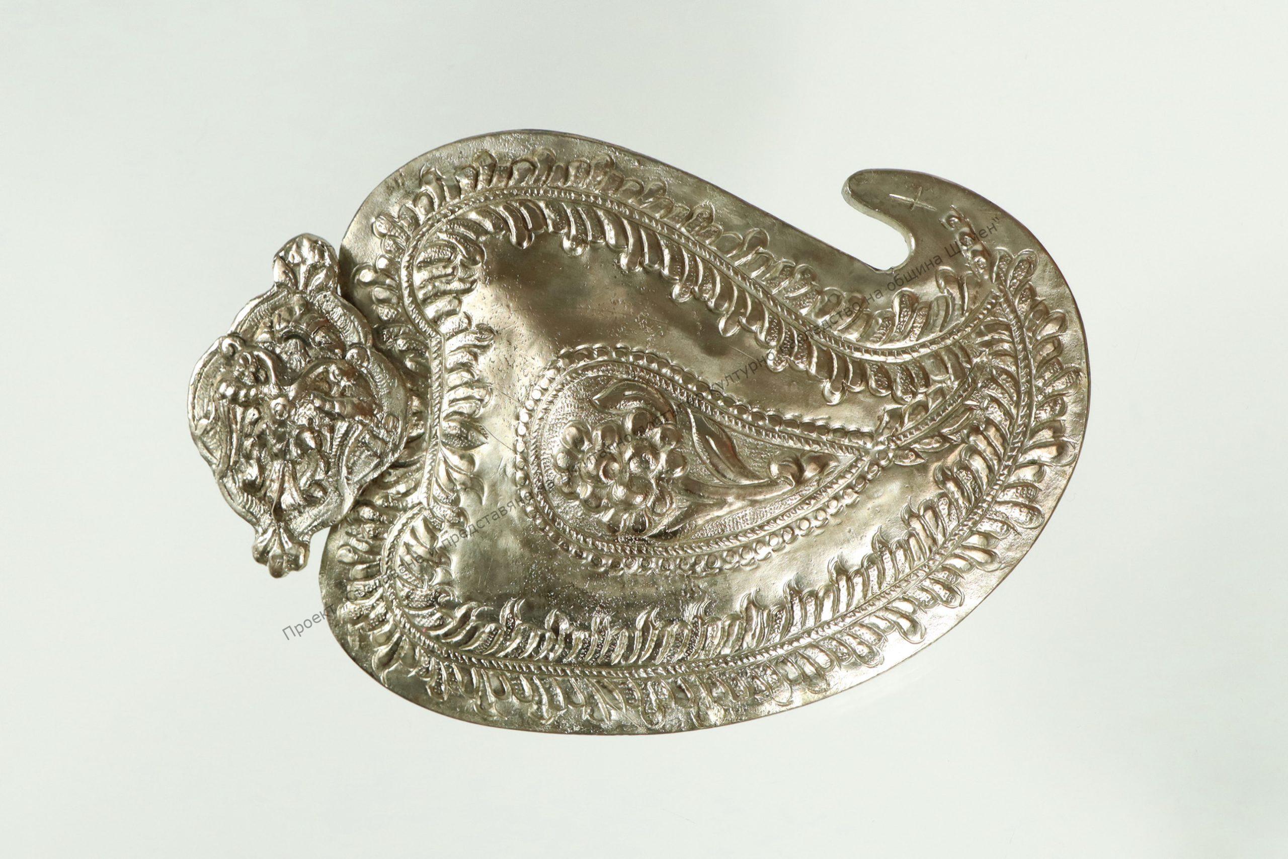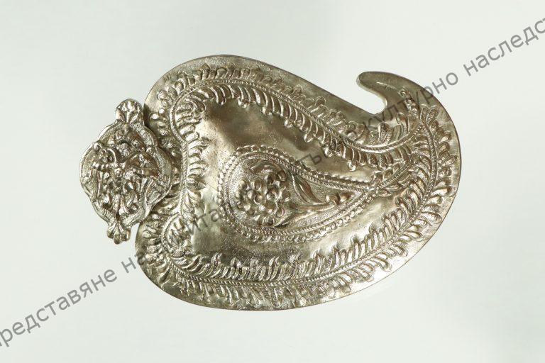 Леко посребрена, с форма на индийска палмета. Релефна украса от двуглав орел и растителни орнаменти