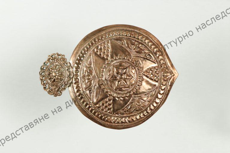 От бронз, лята, кръгла със заострен връх от едната страна. Украса от растителни, геометрични, гранулирани и шнуровидни орнаменти