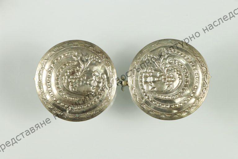 От метал, кръгла форма. Украса от гранулирани елементи, растителни и вълнообразни орнаменти и храм