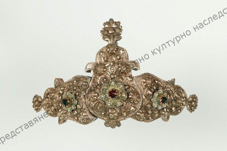 От бронз, ковани, с форма на индийска палмета. От три части. Украса от розети, растителни орнаменти и камъни