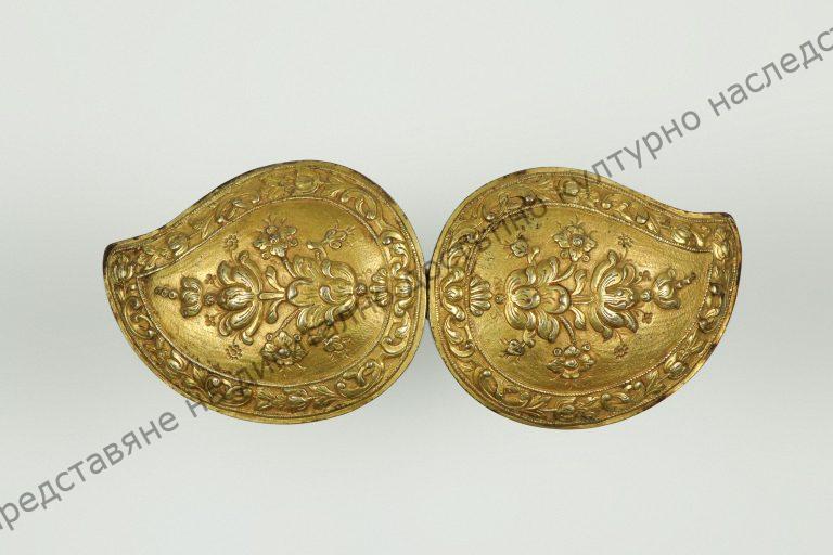 От сребро, лицевата част позлатена. С листовидна форма. Релефна украса от шнуровидни и растителни орнаменти. От XIX век