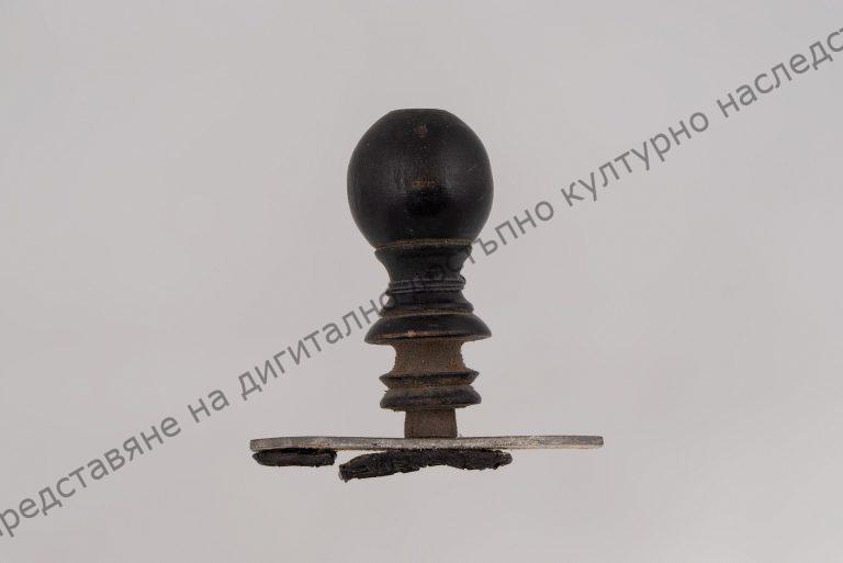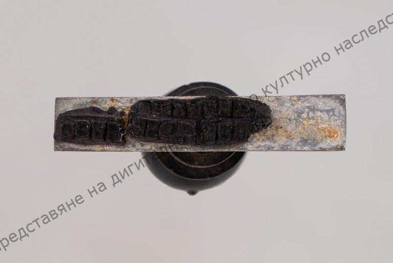 На правоъгълна метална пластинка е монтирана хватка от черно профилирано дърво, завършваща като сфера. Печатът е от негативно изрязани печатни букви на латиница ,,Ованес Авшарян – Шумен“