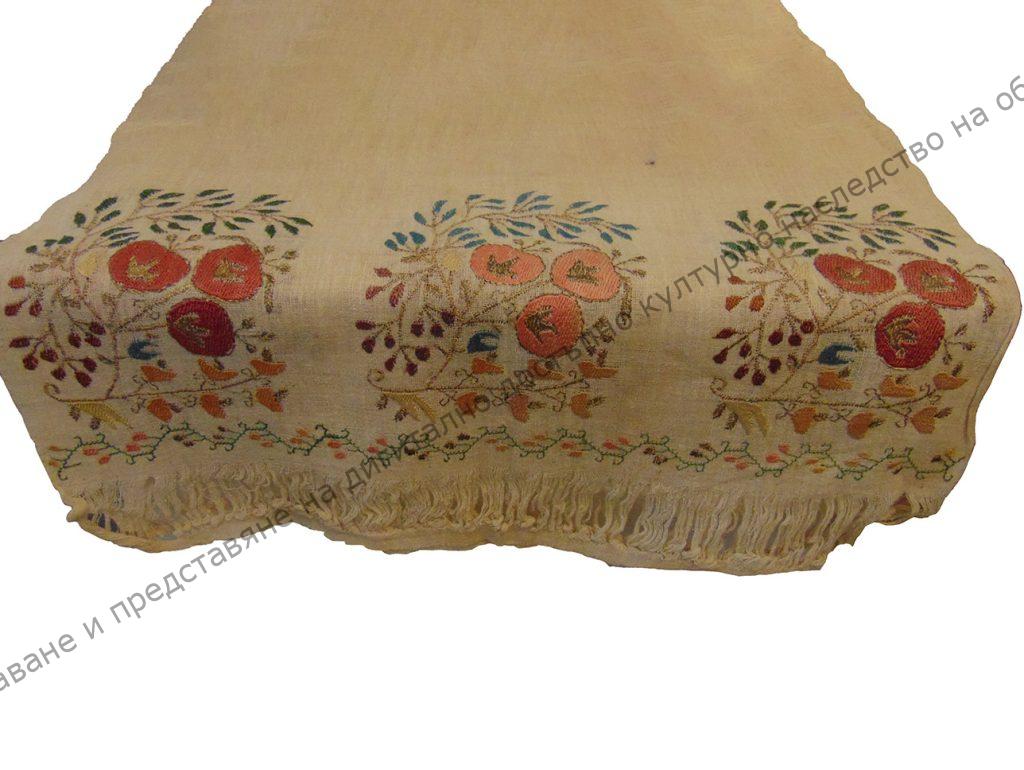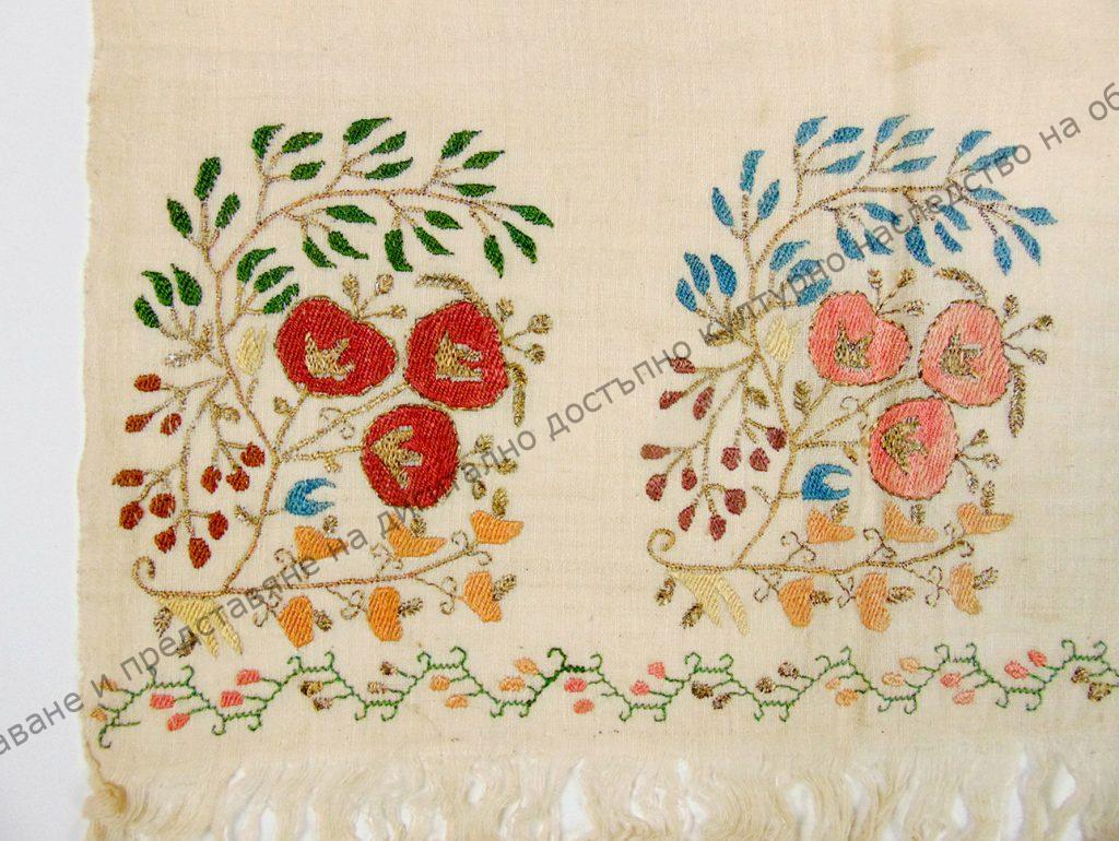 Везано с позлатена сърмена нишка и ленени цветни конци.