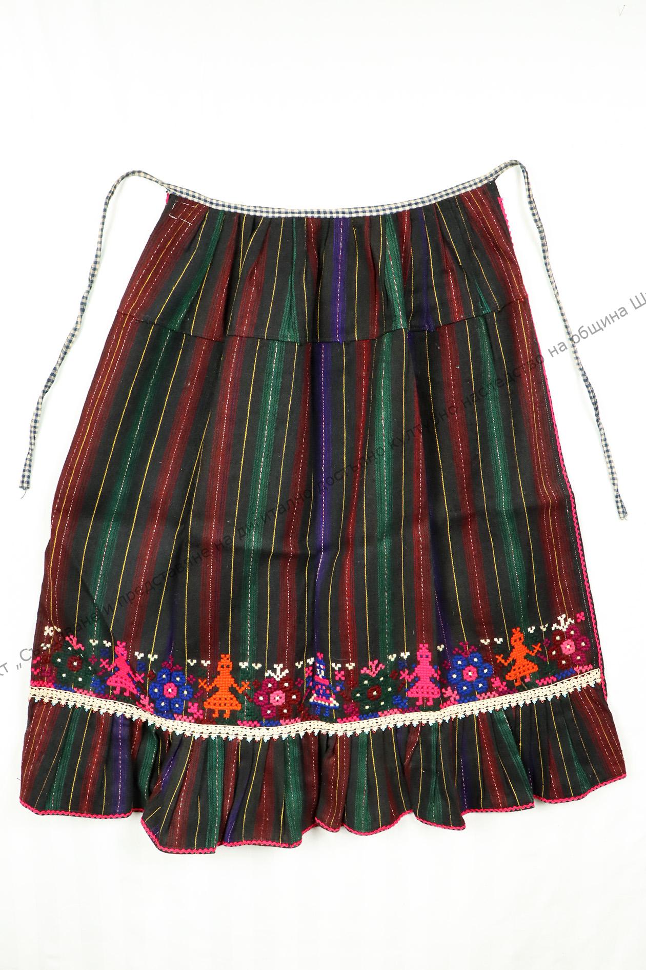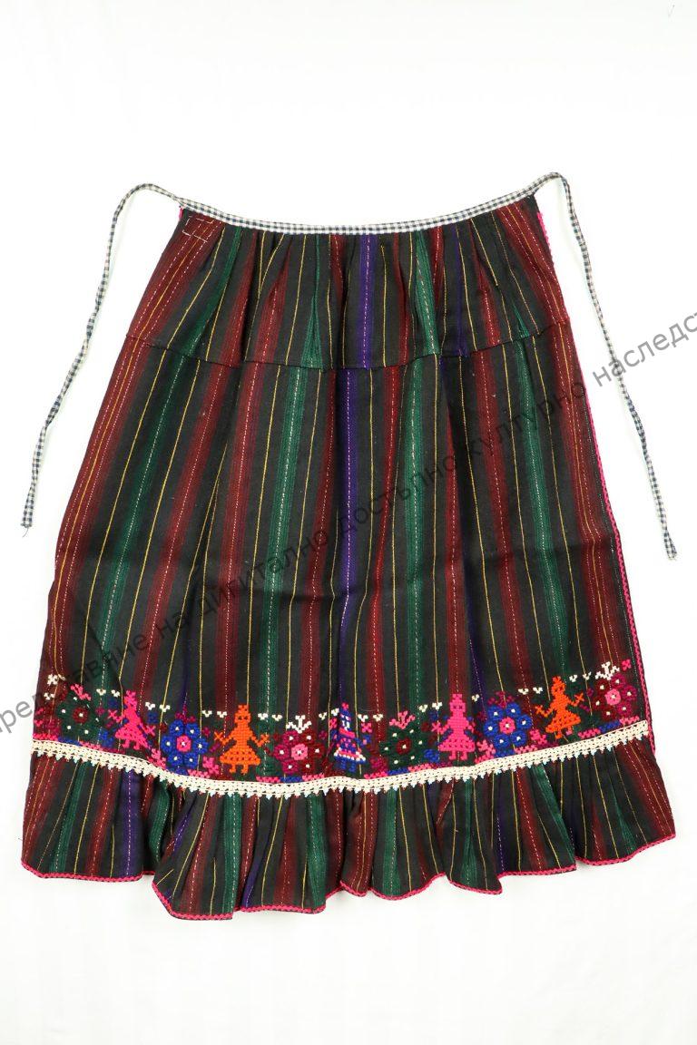 Задна престилка. От вълна. Домашно тъкана на разноцветни ивици, в долния край бордюр от втъкани стилизирани човешки фигури и растителни орнаменти