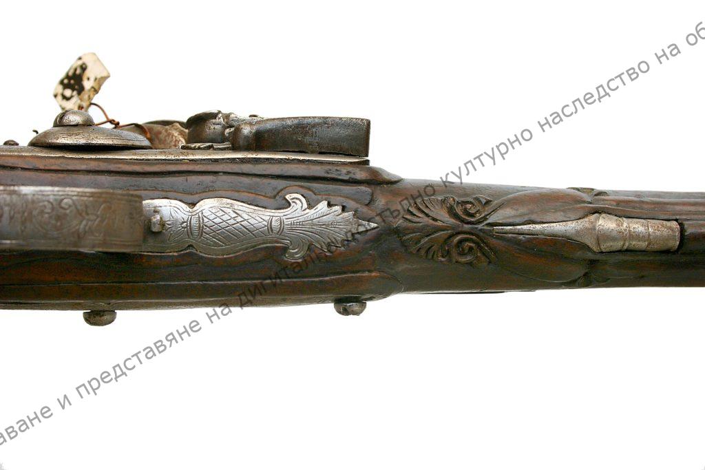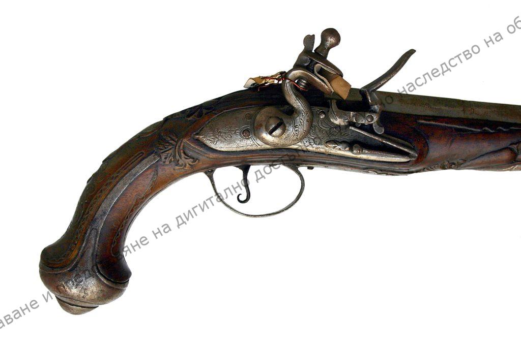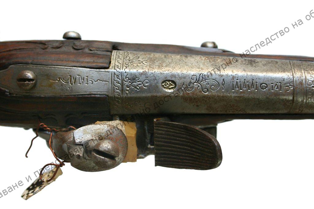 Flintlock pistol with French type mechanism, early 19th century. Bronze inlay with maker’s mark and two groups of unreadable signs at the base of the barrel