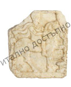 Оброчна плочка на тракийски конник, изработена от бял мрамор. Има правоъгълна форма. Представен е конник в ход надясно, наметнат с хламида, закопчана на лявото рамо с кръгла фибула. Конят с левия си крак е стъпил върху профилиран жертвеник. Пред конника има дърво, около което се увива змия.