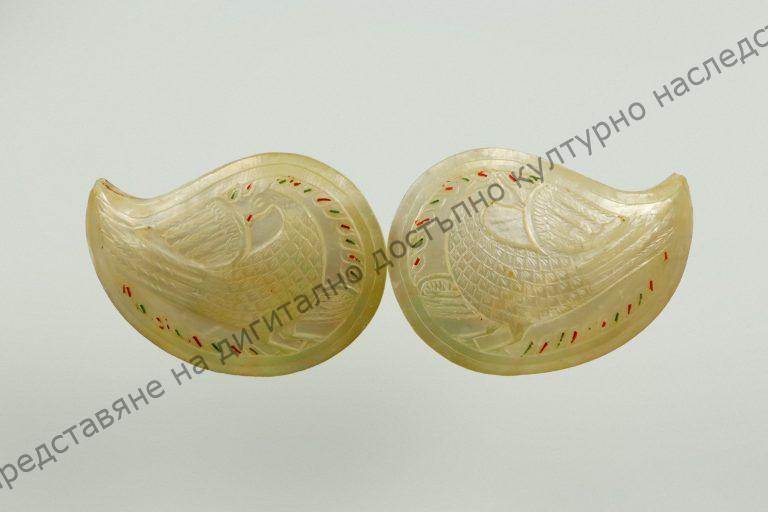 За пафти, седефени, с форма на индийска палмета. Изпъкнало изображение на птица. По края гравирани цветни чертички