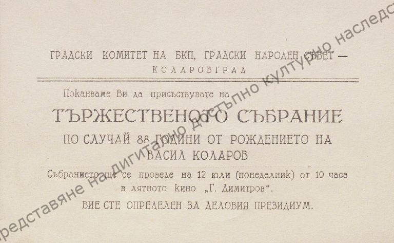 Invitation on the occasion of the 88th anniversary of V. Kolarov, 12th of July 1965. “Vasil Kolarov” Collection