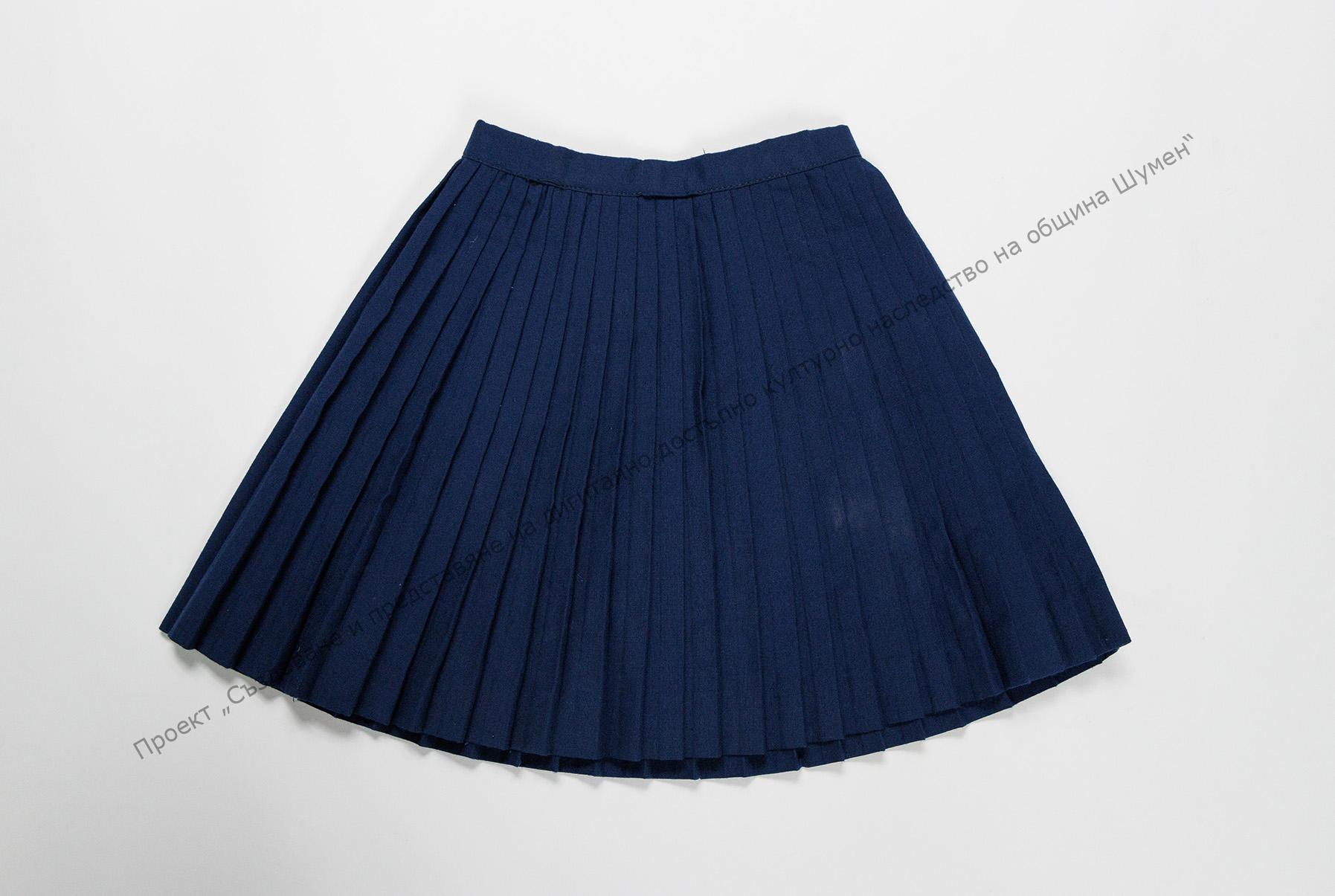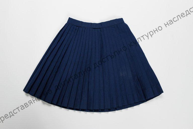 Ученическа плисирана пола за ученичка 4-5 клас, от тъмносин плат „Тропикал“. Използвана като част от пионерска униформа до 1989 г.