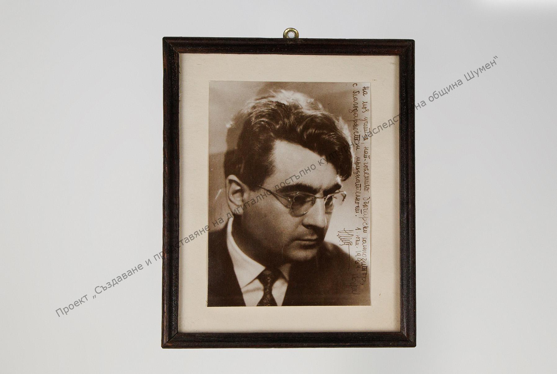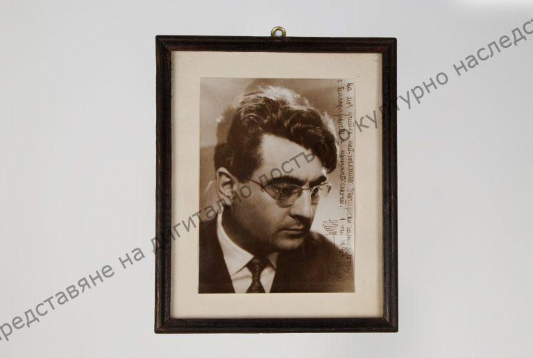 Александър Райчев, с посвещение до Панчо Владигеров; в дървена рамка. Фонд „Панчо Владигеров“