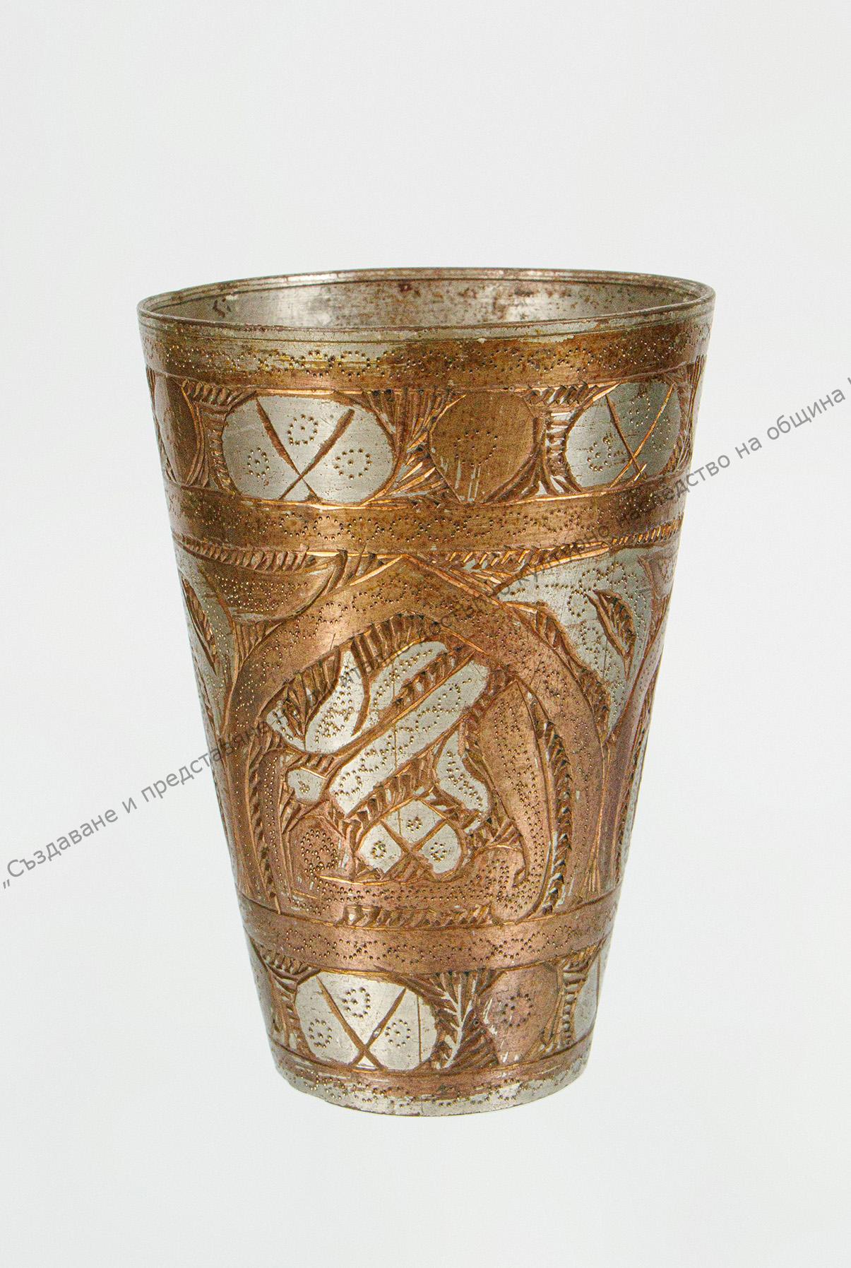 От бронз, отвътре е посребрена. Три пояса украса