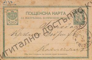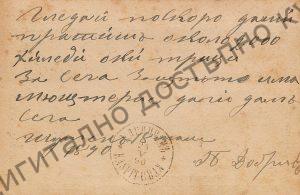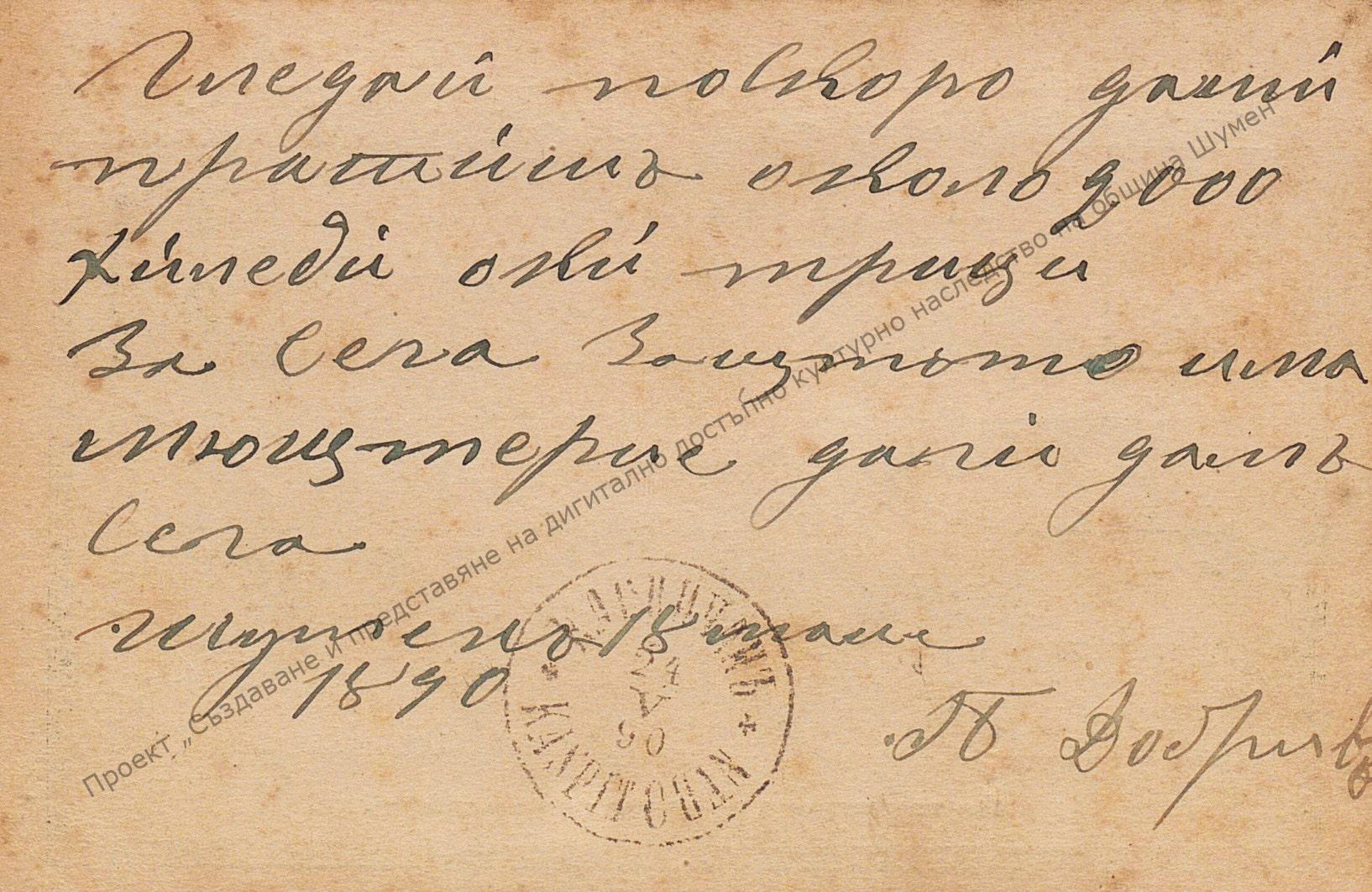 Пощенска картичка до Кръстю Добрев от Каспичан (брат на П. Добрев) от Петър Добрев, 18. V. 1890 г. Шумен. Размер 8/13,5.