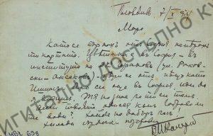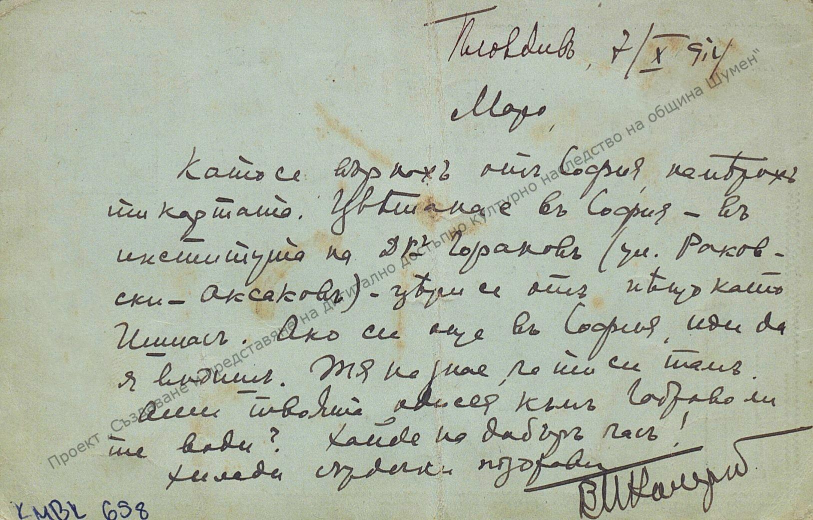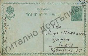 Пощенска картичка до Мара Михайлова, учителка в София, ул. „Брегалница“ 59, от В. Коларов. Пловдив, 7.X.1912 г. Фонд „Васил Коларов“