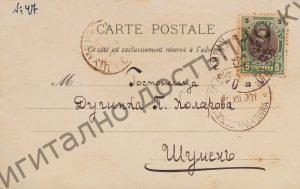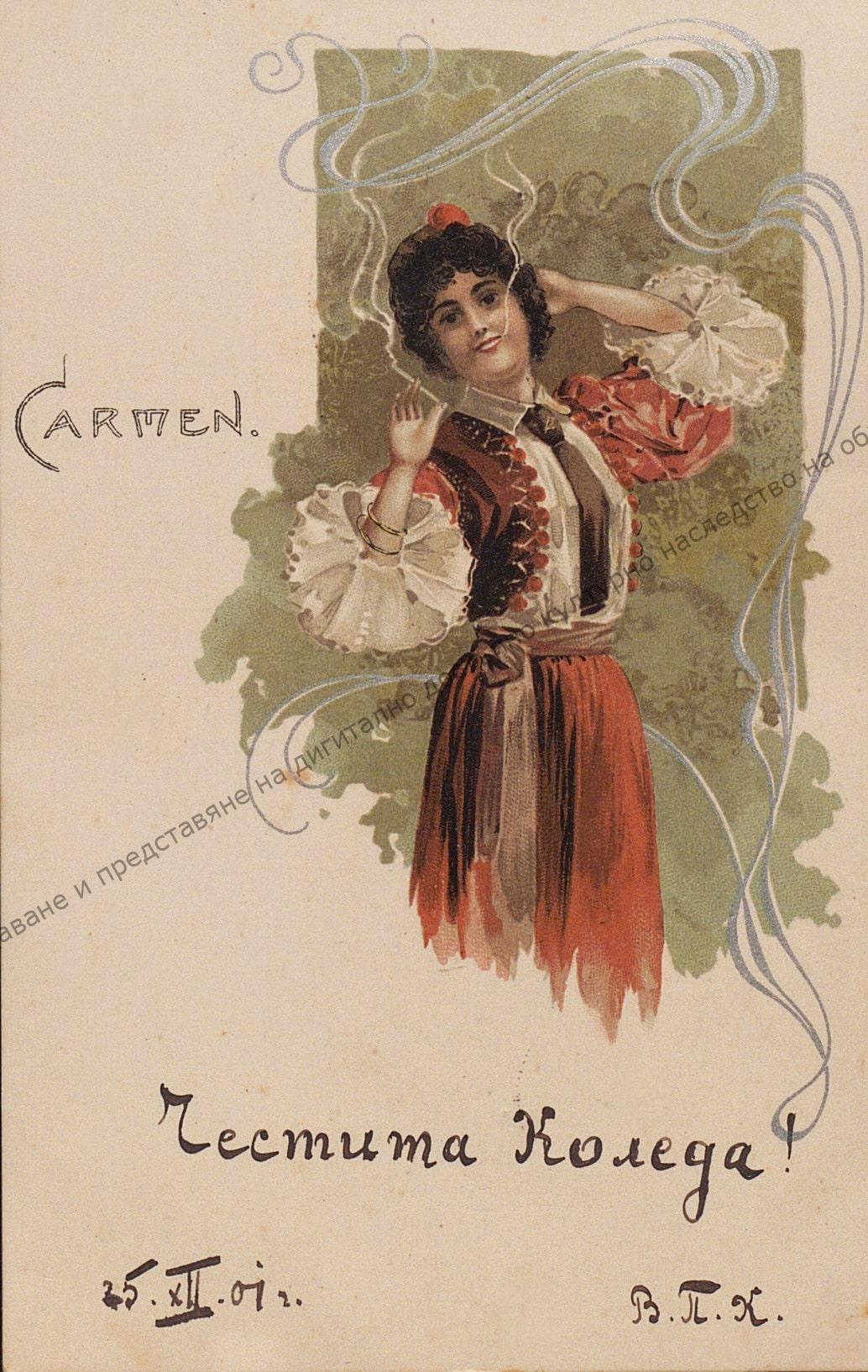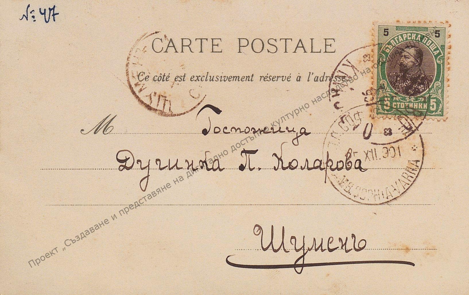 Пощенска картичка до Дочинка Коларова – сестра на В. Коларов, изпратена от В. Коларов, 25. XII. 1901 г. Княжево. Размер 8/13.