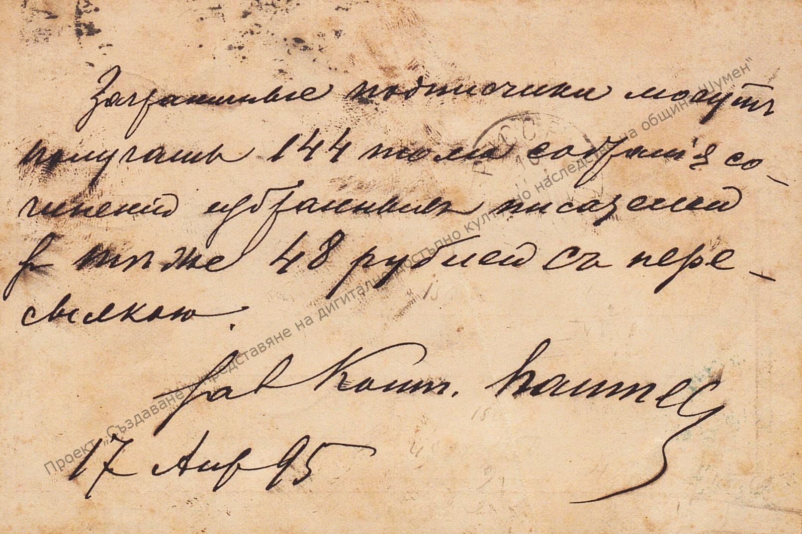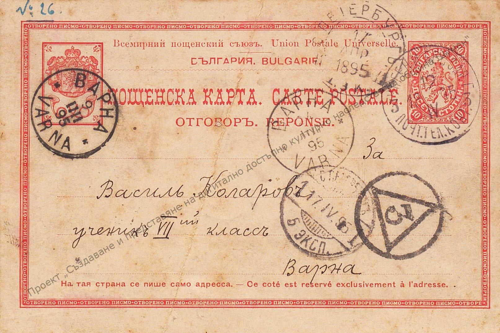 Пощенска картичка до В. Петров Коларов – ученик в VII клас в гр. Варна от Петербург 1895 г. Съобщава му се, че може да си набави 144 тома избрани произведения на руски писатели за 48 рубли. Размер 8,5/13,5.