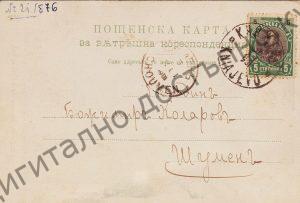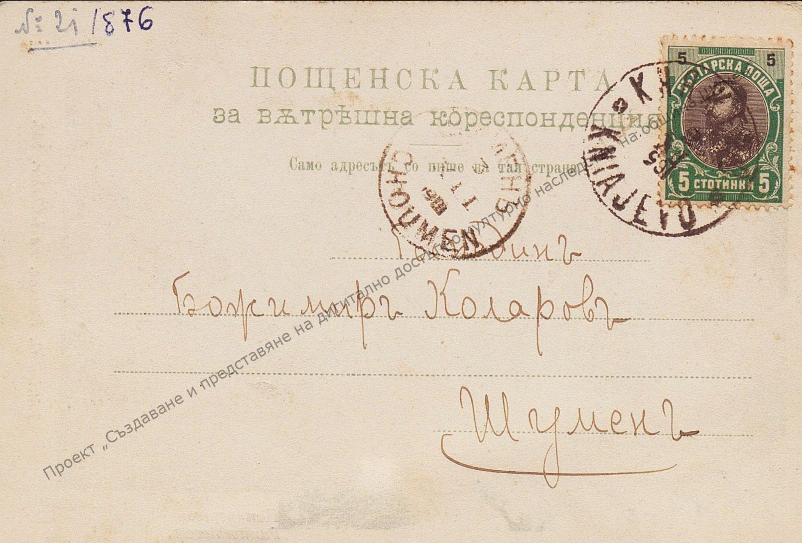Пощенска картичка до Божан Коларов от брат му Васил Коларов, Княжево 1901 г. С изглед към Панчарево. Размер 8,5/13.