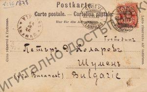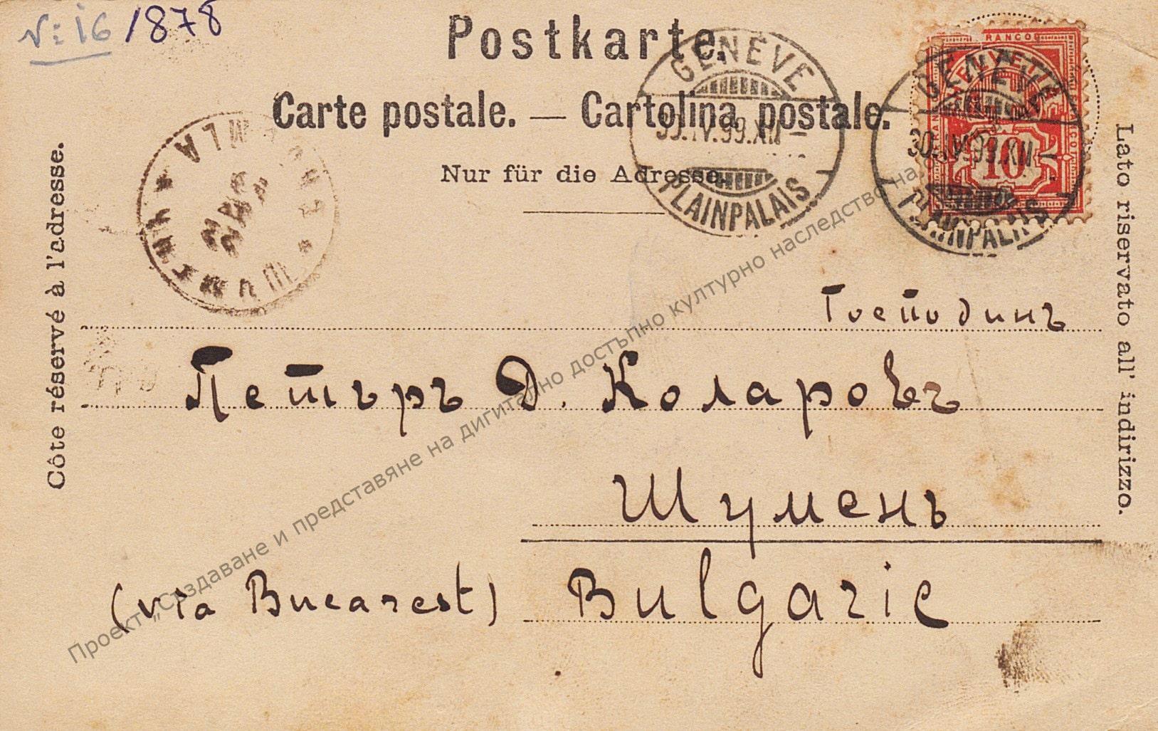 Пощенска картичка до Петър Д. Коларов от сина му В. Коларов, Женева 1899 г. Размер 8,5/13,5.
