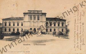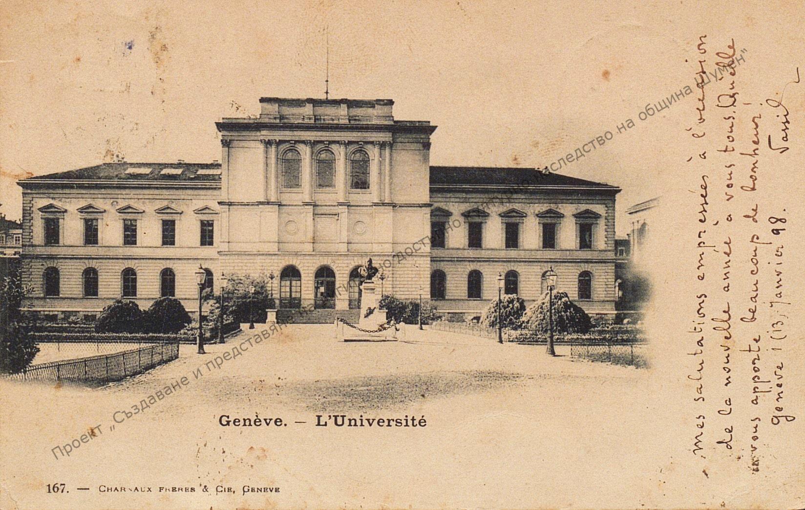 Пощенска картичка до Петър Д. Коларов от сина му В. Коларов. Женева, 1898 г. Френски текст. На лицевата страна – изглед от университета в Женева. Фонд „Васил Коларов“