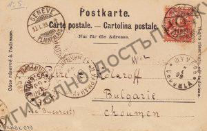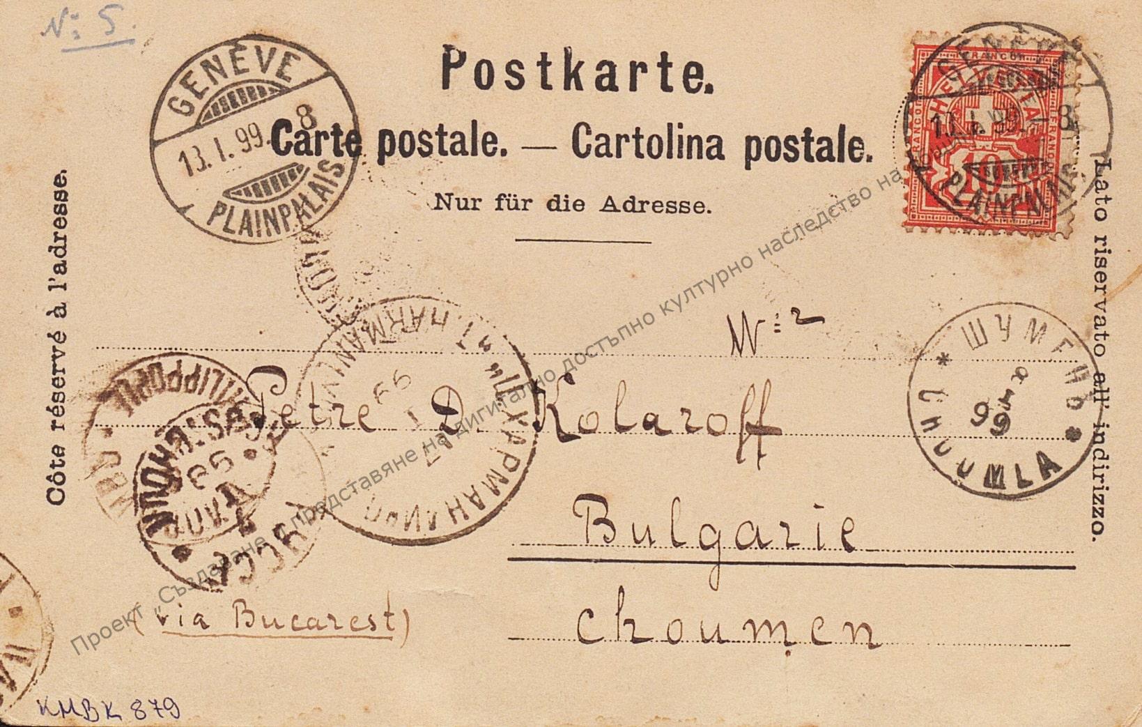 Пощенска картичка до Петър Д. Коларов от сина му В. Коларов, Женева 1898 г. Френски текст. На лицевата страна изглед от университета в Женева. Размер 8,5/13,5.
