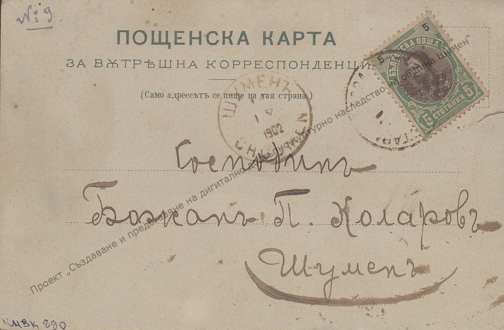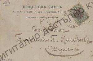 Пощенска картичка до Божан Коларов от В. Коларов, Ст. Загора 1902 г., в която му съобщава, че заминава за Казанлък. Размер 8,5/13,5.