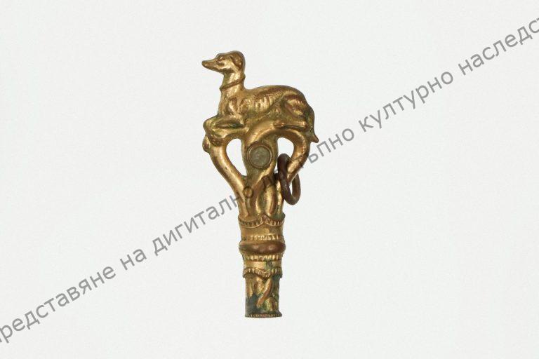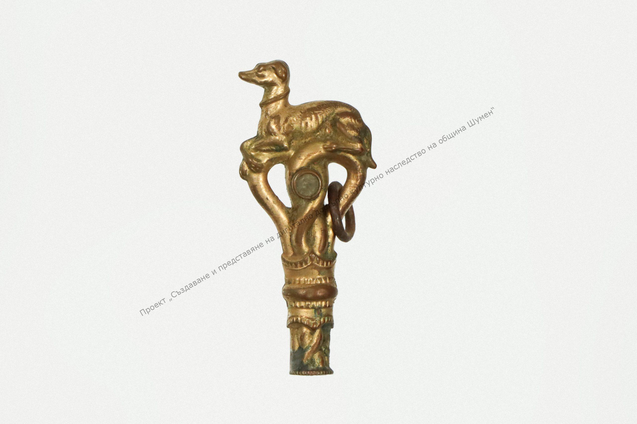 Of brass. Resembling key in the form of a lying dog